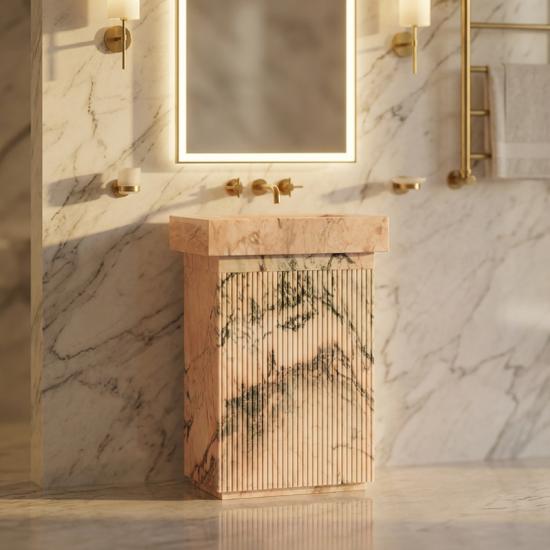 Statuario Rosso Pink Marble is an elegant and rare natural stone, featuring a delicate blush-pink base crossed by dramatic dark grey and black veins, with subtle hints of warm red and burgundy throughout its natural patterns.The countertop and cabinet body are the same of raw material, achieving a continuous and seamless connection of natural textures up and down, maximizing the artistic beauty of natural stone. The marble stone integrated structure completely bids farewell to the pain points of traditional wooden cabinets such as mold, deformation and cracking. It is waterproof and moisture-proof, and is not afraid of the humid environment in the bathroom. Its service life far exceeds that of conventional bathroom cabinets.