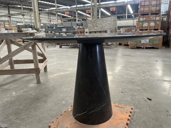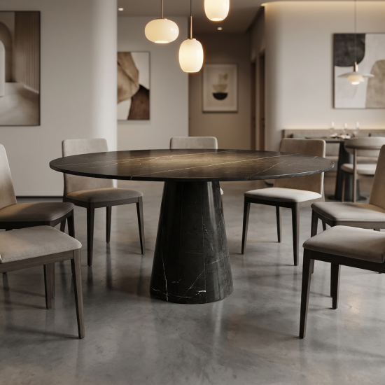 Crafted from natural Nero Marquina marble, this round dining table brings timeless luxury and modern minimalist style to any dining space. The seamless round tabletop features a high-gloss polished finish, showcasing the stone’s signature deep black base with striking natural white veining—each piece boasts one-of-a-kind, irreplicable patterns for a truly unique piece. Paired with a matching tapered solid marble pedestal base, it delivers exceptional stability, sturdiness, and a cohesive high-end aesthetic.